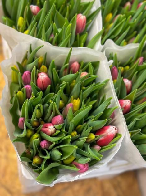 Įvairiaspalvių tulpių puokštė 50 vnt.
